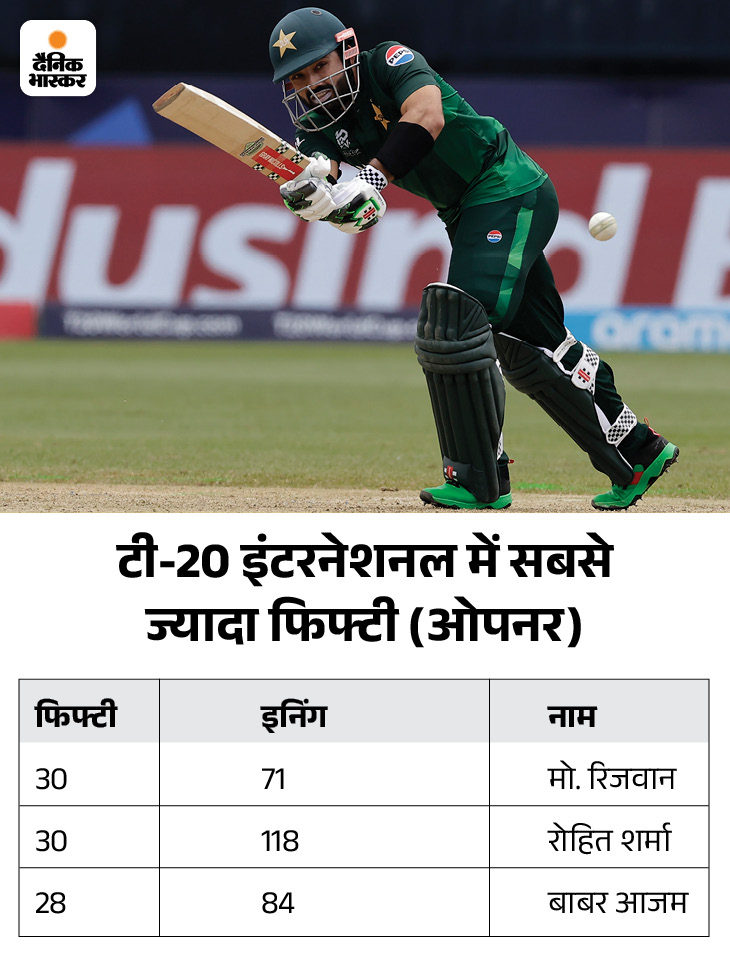 टी-20 इंटरनेशनल में किसी भी ओपनर बल्लेबाज द्वारा सबसे ज्यादा फिफ्टी लगाने के मामले में रिजवान सबसे आगे निकल गए है। उन्होंने भारत के रोहित शर्मा को पीछे छोड़ा है। 71 इनिंग में रिजवान ने 30 फिफ्टी लगाई है। जबकि भारतीय कप्तान रोहित शर्मा ने 118 इनिंग में 30 फिफ्टी लगाई है।