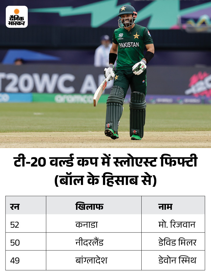 टी-20 वर्ल्ड कप में बॉल के हिसाब से हाफसेंचुरी लगाने के मामले में मो. रिजवान पहले नंबर पर आ गए है। उन्होंने आज कनाडा के खिलाफ 53 बॉल पर 53 रन बनाए।
