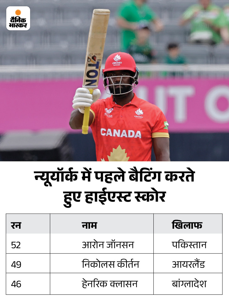टी-20 वर्ल्ड कप में 2024 के नसाउ इंटरनेशनल स्टेडियम में पहले बैटिंग करते हुए किसी बल्लेबाज द्वारा सबसे ज्यादा स्कोर बनाने वाले बल्लेबाज आरोन जॉनसन बन गए है। उन्होंने आज के मैच में 52 रन की पारी खेली।