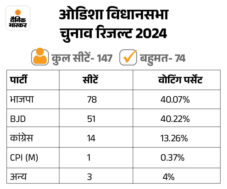 ओडिशा विधानसभा की 147 सीटों में से BJP ने 78 सीटें जीती हैं। वहीं, पटनायक की BJD को सिर्फ 51 सीटें मिली हैं। नवीन पटनायक ने 5 मार्च 2000 को पहली बार मुख्यमंत्री पद की शपथ ली थी। तब से जून 2024 तक वे 5 बार से ओडिशा के CM रहें। 2009 विधानसभा चुनाव से पहले BJD ने भाजपा से 11 साल पुराना का गठबंधन तोड़ था। 2000 और 2004 में BJD-BJP गठबंधन की सरकार थी।
