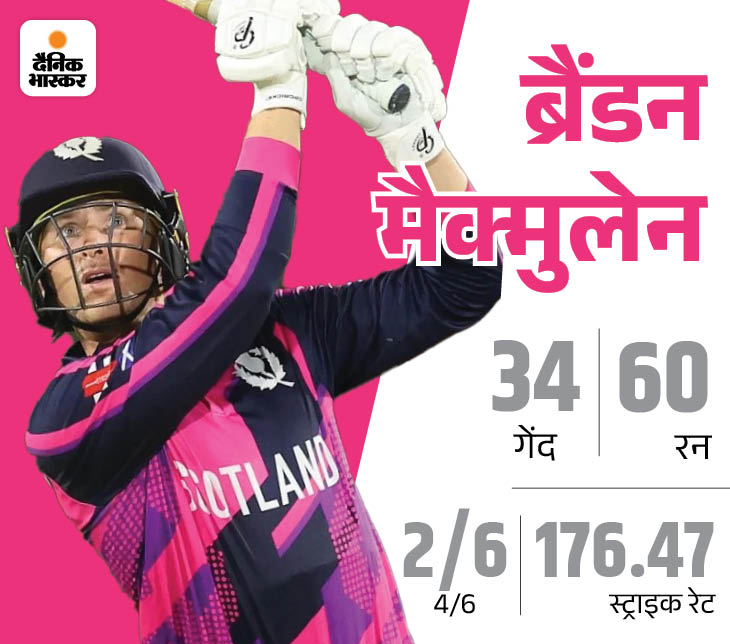 स्कॉटलैंड के तीसरे नंबर के बल्लेबाज ब्रैंडन मैकमुलेन ने अर्धशतकीय पारी खेली और टीम का स्कोर 180 तक ले जाने में अहम भूमिका निभाई। उन्होंने 34 बॉल पर 60 रन बनाए। यह उनकी चौथी टी-20 इंटरनेशनल फिफ्टी रही। वहीं ऑस्ट्रेलिया के खिलाफ पहली है।