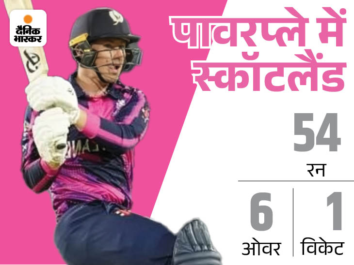 स्कॉटलैंड की शुरुआत अच्छी नहीं रही। टीम को पहले ही ओवर में झटका लगा। ओपनर माइकल जोन्स को एश्टन एगर ने क्लीन बोल्ड कर दिया। लेकिन यहां से टीम ने वापसी की और पावरप्ले में 54 रन बनाए।