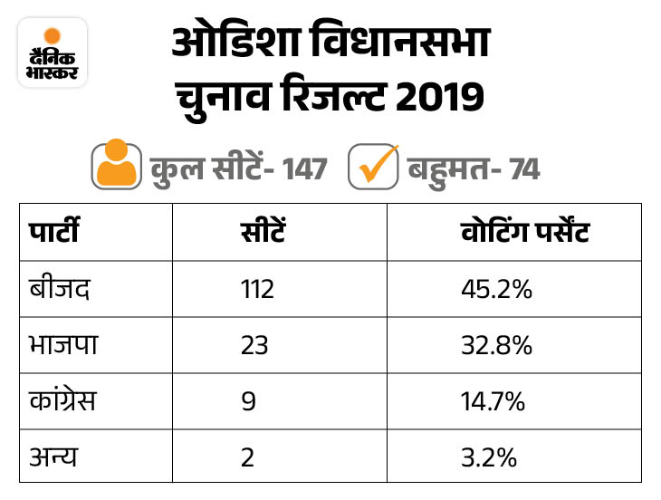 2019 में BJD ने 112 सीटें जीतीं। भाजपा 23, कांग्रेस 9 और अन्य के खाते में दो सीटें आईं। 2024 के चुनाव में भी भाजपा और BJD के गठबंधन के कयास लगाए जा रहे थे, लेकिन सीट शेयरिंग पर सहमति नहीं बन पाई। हालांकि, इस बार भाजपा की ओर से खुद प्रधानमंत्री मोदी 10 से ज्यादा सभाएं-रैलियां की। उन्होंने हर रैली में कहा कि 4 जून को नवीन बाबू रिटायर होंगे और 10 जून को BJP का CM शपथ लेगा।