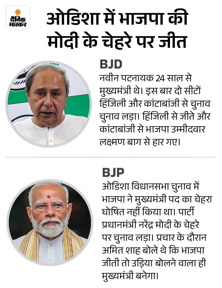ओडिशा में BJD साल 2000 से लगातार सत्ता में रही। BJD अध्यक्ष नवीन पटनायक 24 साल से मुख्यमंत्री हैं। उन्होंने 5 मार्च 2000 को पहली बार मुख्यमंत्री पद की शपथ ली थी। तब से 2019 तक वे 5 बार से ओडिशा के CM हैं।