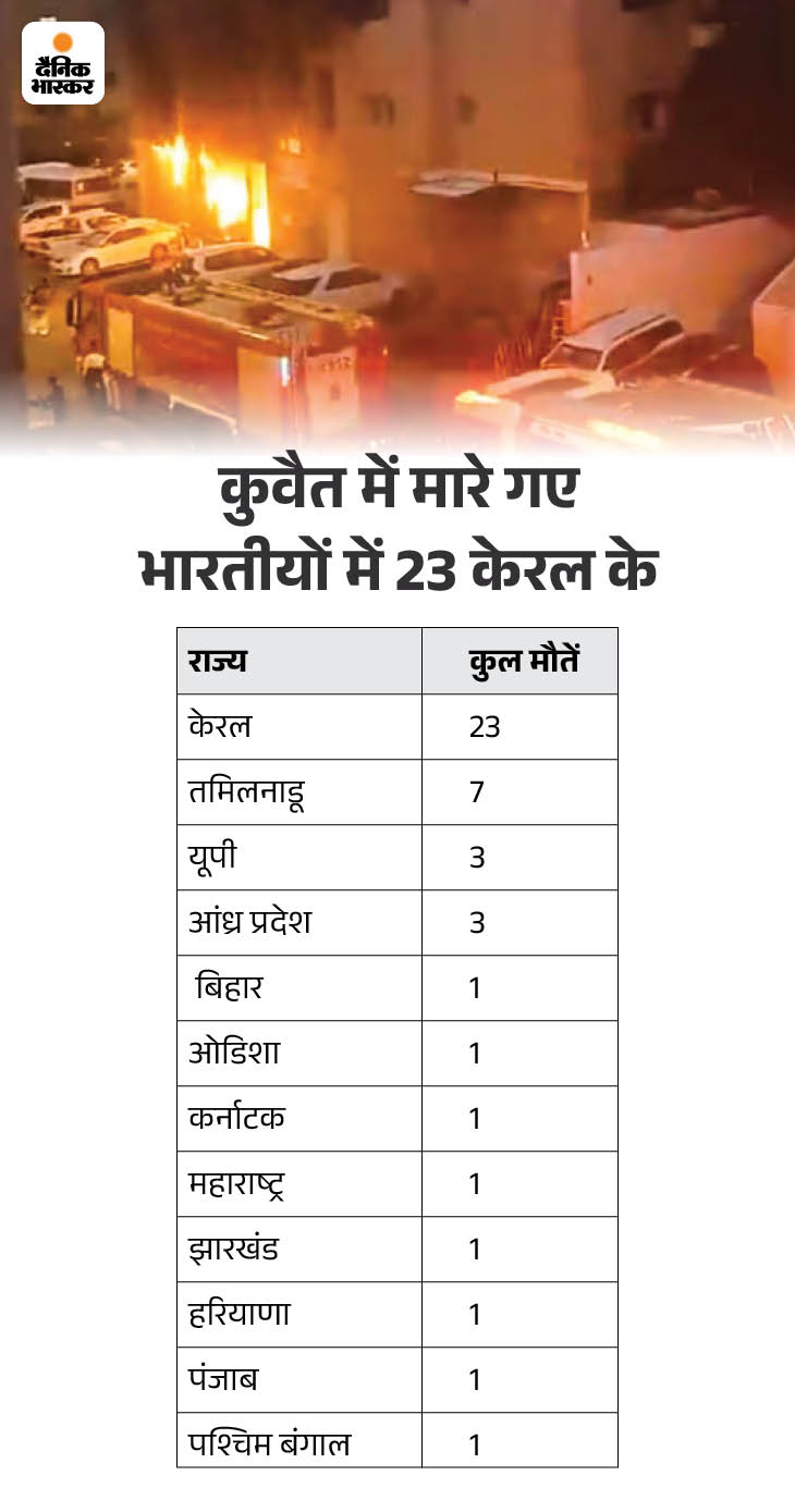 जान गंवाने वाले अन्य 22 लोगों में तमिलनाडु के 7, आंध्र-उत्तर प्रदेश के 3-3 और बिहार, ओडिशा, कर्नाटक, महाराष्ट्र, झारखंड, हरियाणा, पंजाब और पश्चिम बंगाल के 1-1 लोग हैं। एक मृतक किस राज्य का है, इसकी जानकारी अब तक नहीं मिली है। वहीं इस मामले कुवैत ने अब तक 3 आरोपियों को गिरफ्तार किया है।