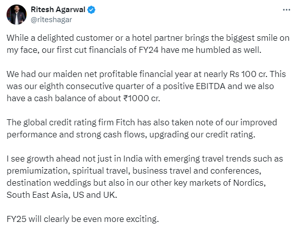 उन्होंने सोशल मीडिया प्लेटफार्म X पर लिखा था- एक खुश कस्टमर या होटल पार्टनर मेरे चेहरे पर सबसे बड़ी मुस्कान लाता है, FY24 के हमारे पहले फाइनेंशियल ने मुझे भी विनम्र बना दिया है। हमारा पहला नेट प्रॉफिट वाला वित्तीय वर्ष लगभग 100 करोड़ रुपए रहा।