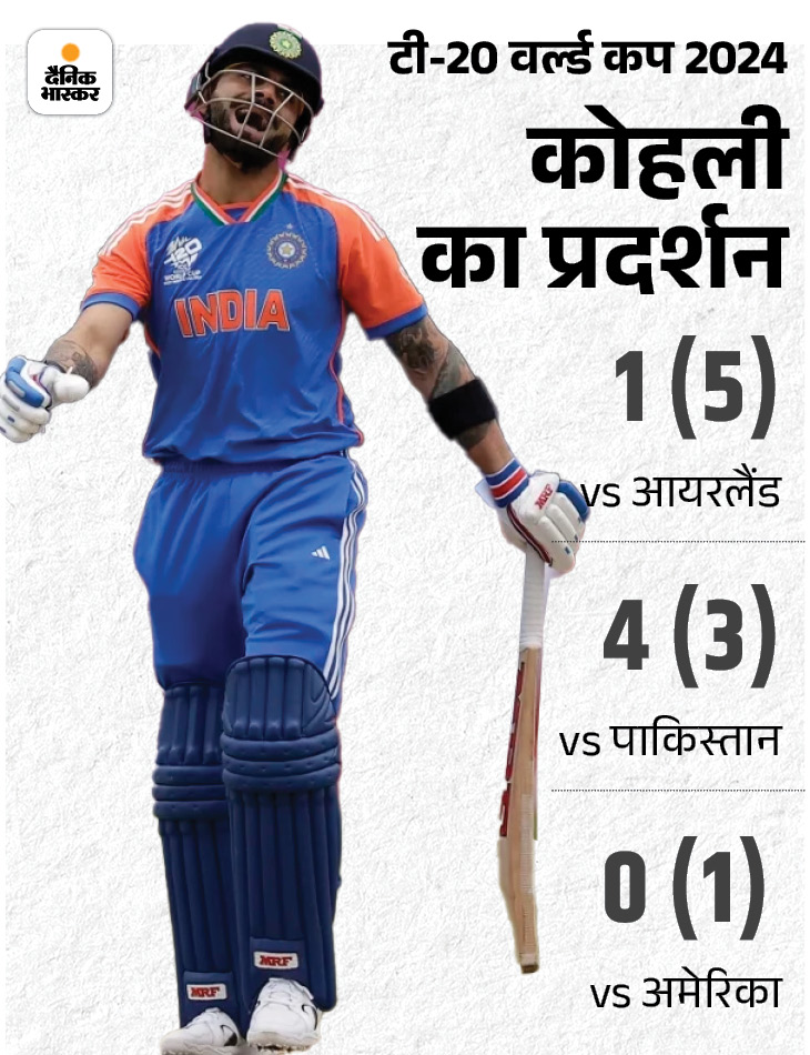 1, 4 और 0…ये विराट कोहली के टी-20 वर्ल्ड कप 2024 के 3 स्कोर हैं। टूर्नामेंट इतिहास में विराट ने इनसे पहले 27 पारियां खेलीं, सभी में नंबर-3 पर उतरे और कभी भी 5 रन के अंदर आउट नहीं हुए, लेकिन जैसे ही उन्होंने ओपनिंग करनी शुरू की, 5 रन का आंकड़ा भी नहीं छू सके। पढ़ें पूरी खबर…