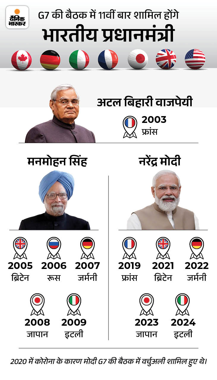 इटली की प्रधानमंत्री जॉर्जिया मेलोनी ने चुनाव से पहले ही उन्हें इस समिट का न्योता भिजवा दिया था। हालांकि, ये पहली बार नहीं जब भारत को इस संगठन ने गेस्ट के तौर पर बुलाया हो। भारत सबसे पहले 2003 में इस समिट में शामिल हुआ था। इसके लिए तत्कालीन प्रधानमंत्री अटल बिहारी वाजपेयी फ्रांस गए थे।