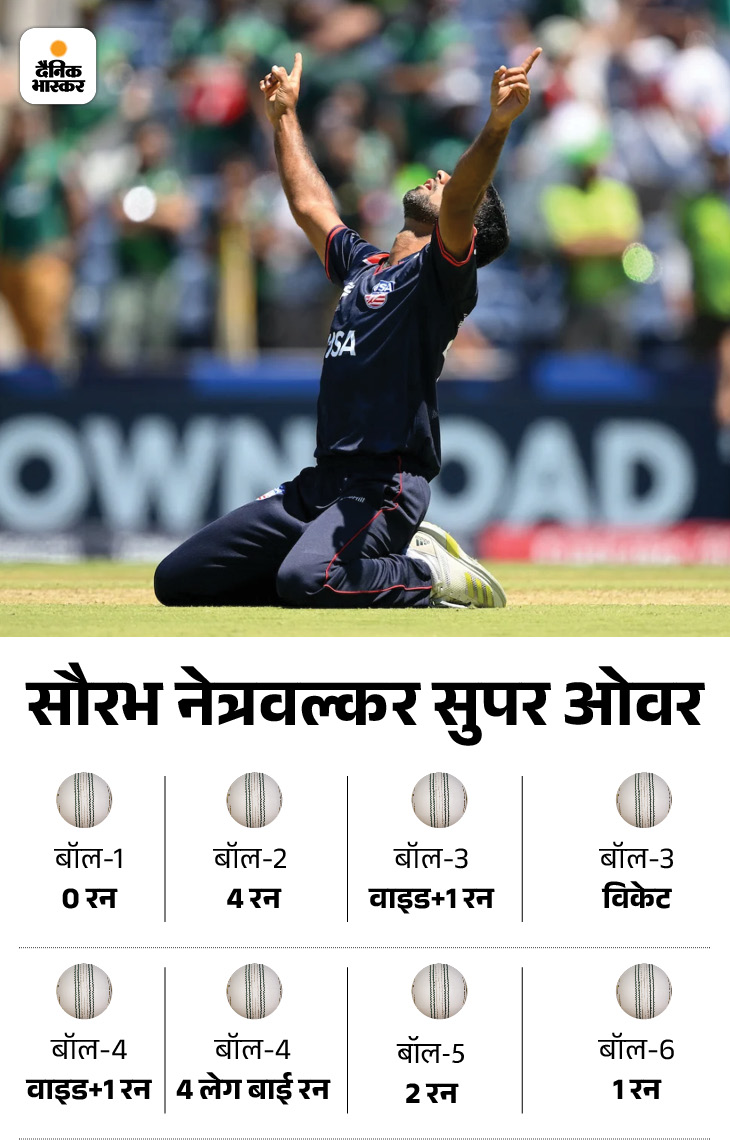 अमेरिका ने सुपर ओवर में 18 रन बनाए। कप्तान मोनांक पटेल ने 18 रन को बचाने के लिए सौरभ को बॉलिंग दी। सौरभ ने सुपर ओवर में मात्र 13 रन दिए और अमेरिका ने इस वर्ल्ड कप का सबसे बड़ा उलटफेर करते हुए पाकिस्तान को हरा दिया। सौरभ मैच के सुपर हीरो बन गए।