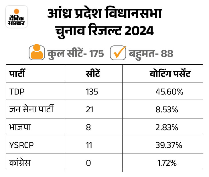 आंध्र प्रदेश में 4 जून को लोकसभा चुनाव के साथ विधानसभा चुनाव के रिजल्ट आए थे। विधानसभा में NDA ने 175 में से 164 सीटें जीतकर एकतरफा जीत हासिल की। इसमें नायडू की TDP को 135, पवन कल्याण की जनसेना को 21 और भाजपा को 8 सीटें मिली हैं।
