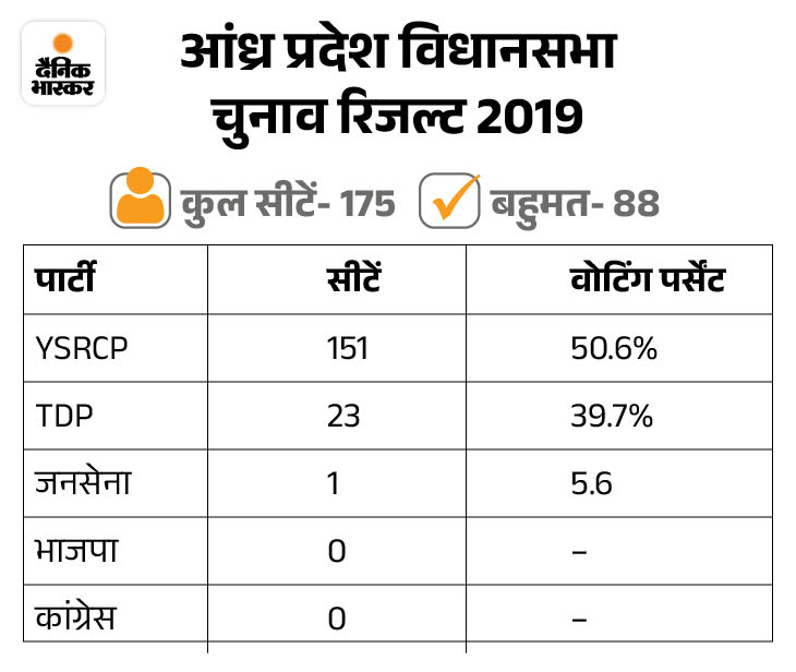 YSRCP अध्यक्ष जगन मोहन रेड्डी ने 2019 विधानसभा चुनाव में राज्य की 175 में से 151 सीटें लाकर एकतरफा जीत दर्ज की थी। TDP सिर्फ 23 सीटें जीत पाई थी। जगन मोहन 2019 में पहली बार राज्य के CM बने थे।