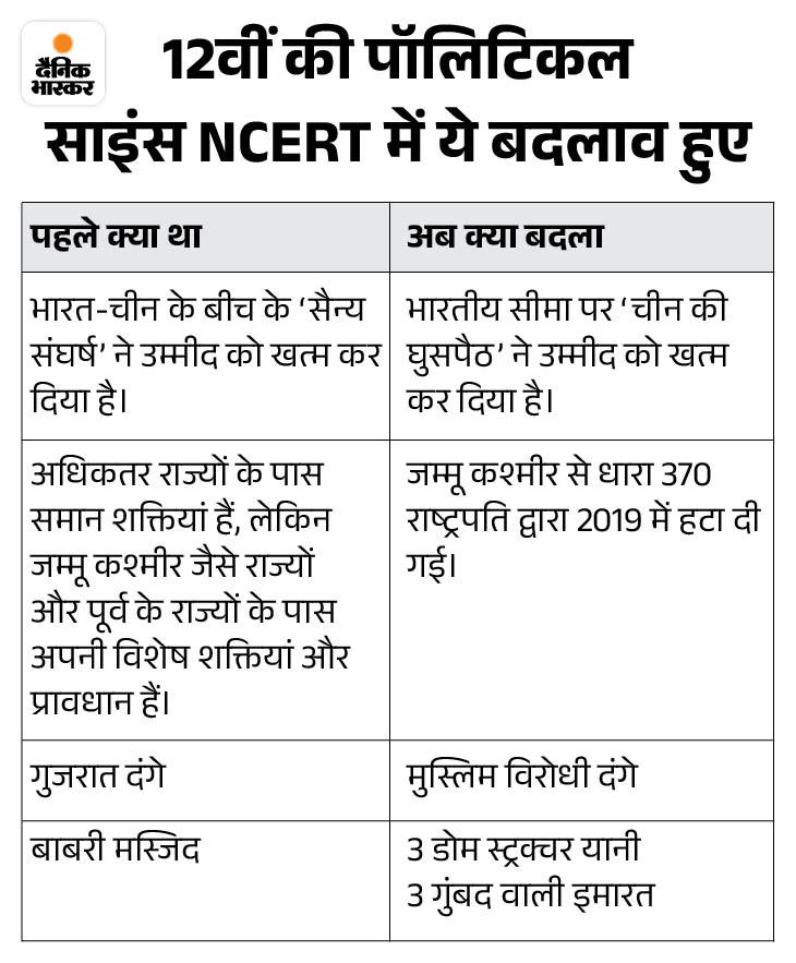 3. NCERT की किताब में हुए बदलाव, ‘भारत चीन सैन्य संघर्ष’ को ‘चीन की घुसपैठ’ लिखा NCERT की पॉलिटिकल साइंस की किताब में ‘चीन के साथ भारत के संबंध और स्थिति’ से जुड़े चैप्टर में बदलाव किया गया है। 12वीं में कंटेंपरेरी वर्ल्ड पॉलिटिक्स के दूसरे चैप्टर में भारत-चीन टाइटल के कंटेंट में भी बदलाव कर दिया गया है। पहले किताब के पेज नंबर 25 पर लिखा था कि भारत-चीन के बीच के ‘सैन्य संघर्ष’ ने उम्मीद को खत्म कर दिया है। अब इस वाक्य की जगह लिखा है – भारतीय सीमा पर ‘चीन की घुसपैठ’ ने उम्मीद को खत्म कर दिया है। इस वाक्य से सैन्य संघर्ष शब्द को बदलकर अब घुसपैठ कर दिया गया है। इसके अलावा 2019 में संविधान से आर्टिकल 370 हटाने का जिक्र भी शामिल है।