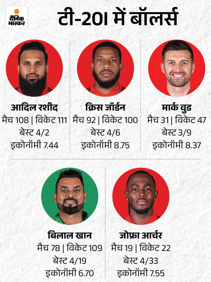 बॉलर्स के तौर पर आदिल रशीद, क्रिस जॉर्डन, मार्क वुड, बिलाल खान और जोफ्रा आर्चर को चुन सकते हैं
