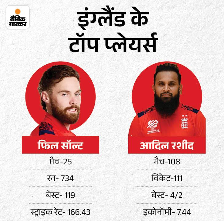 इंग्लैंड के सलामी बल्लेबाज फिल सॉल्ट IPL 2024 से ही फॉर्म में हैं। ​उन्होंने कोकालता की ओर से 12 मैच में 435 रन बनाए थे। वह इंग्लैंड के टॉप स्कोरर हैं। उन्होंने ऑस्ट्रेलिया के खिलाफ हुए पिछले मैच में भी 23 गेंदों में 37 रन की पारी खेली थीं। वहीं, स्पिनर आदिल रशीद टीम के टॉप विकेट टेकर हैं। वह 108 मैच में 111 विकेट झटक चुके हैं। ऑस्ट्रेलिया से हुए मैच मे उन्होंने मैक्सवेल को आउट किया था