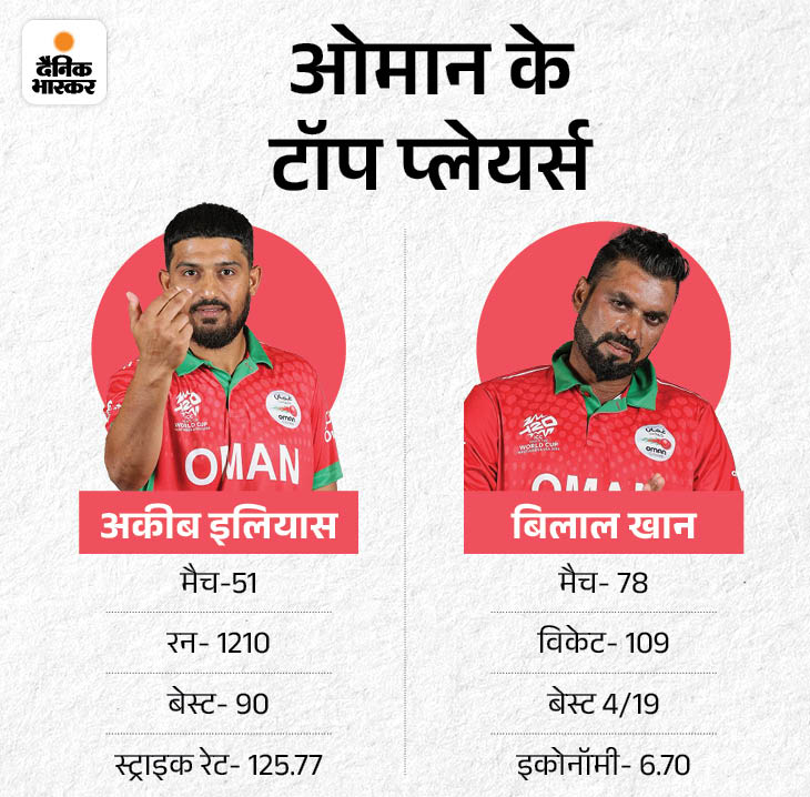पिछले 3 मुकाबलों के आधार पर ओमान की टीम में अयान खान ने शानदार बल्लेबाजी की है। वे 3 मैचों में 92 रन बना चुके हैं। उन्होंने स्कॉटलैंड के खिलाफ 41 रन की पारी खेली थी। वहीं, दूसरी ओर मेहरान खान ने 3 मैचों में 6 विकेट लेकर प्रभावित किया है। पिछले रिकॉर्ड्स को देखा जाए तो टीम के कप्तान अकीब इलियास ने 51 मुकाबलों में 1210 रन बनाए हैं। वह अपनी टीम के टॉप स्कोरर हैं। वहीं, बिलाल खान सबसे ज्यादा विकेट लेने वाले खिलाड़ी हैं।
