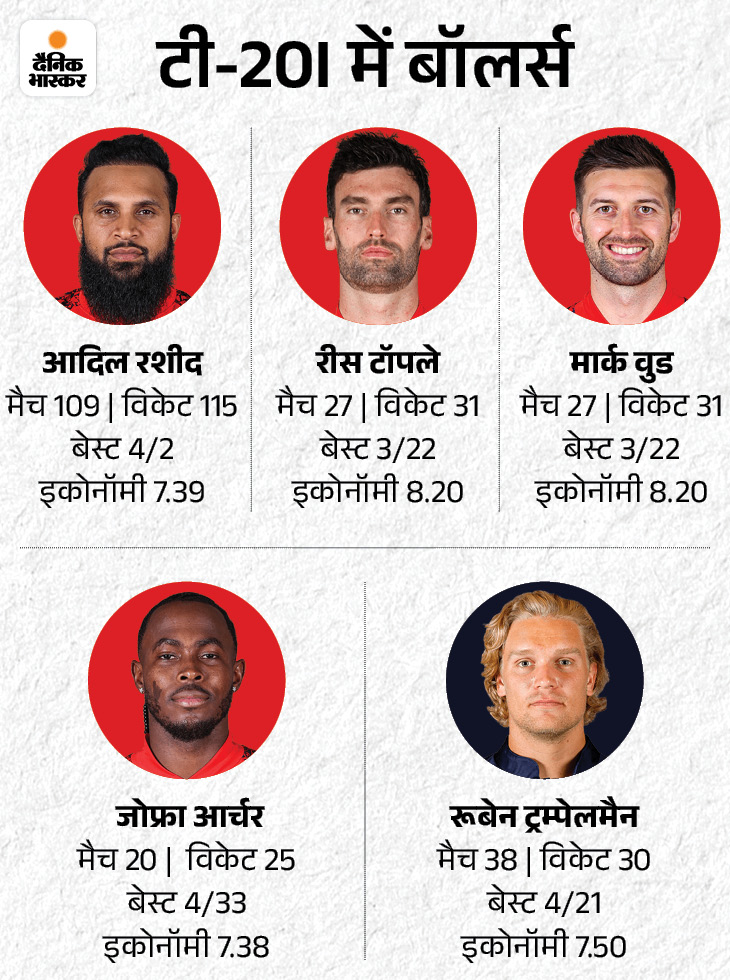बॉलर्स के तौर पर आदिल रशीद, रीस टॉपले, मार्क वुड, जोफ्रा आर्चर और रूबेन ट्रम्पेलमैन को चुन सकते हैं