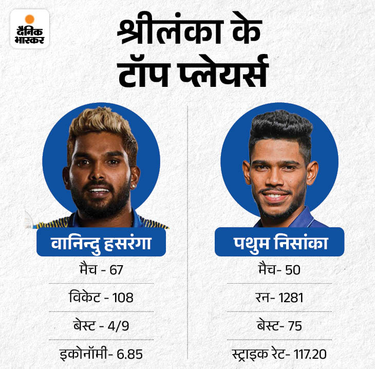 श्रीलंका के कप्तान वानिन्दु हसरंगा टी-20 में टीम के टॉप विकेट टेकर हैं। उन्होंने 67 मैचों में 6.85 की इकोनॉमी से 108 विकेट लिए हैं। टी-20 वर्ल्ड कप 2024 में खेले दो मुकाबलों में हसरंगा ने 2-2 विकेट झटके हैं। वहीं, सलामी बल्लेबाज पथुम निसंका ने साउथ अफ्रीका के खिलाफ 47 रन की शानदार पारी खेली थी। वह, कुल 50 टी-20 मुकाबले में 1281 रन बना चुके हैं। हालांकि, दोनों के अच्छे प्रद्रर्शन के बावजूद टीम एक भी मुकाबला नहीं जीत सकी है।