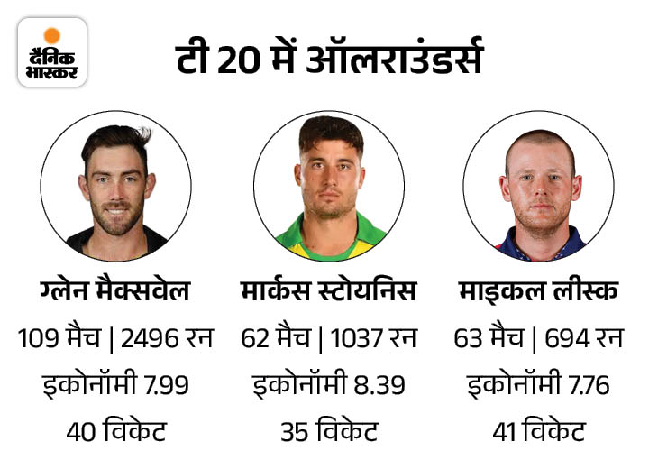 - ग्लेन मैक्सवेल ने टी-20 वर्ल्ड के खेले 3 मैचों में 107.69 की स्ट्राइक रेट रन बनाए हैं। वहीं अब तक खेले 109 मैचों में 154.74 की स्ट्राइक रेट से 2496 रन बनाए हैं। साथ ही 7.99 की इकोनॉमी से गेंदबाजी की है और 40 विकेट भी लिए हैं।