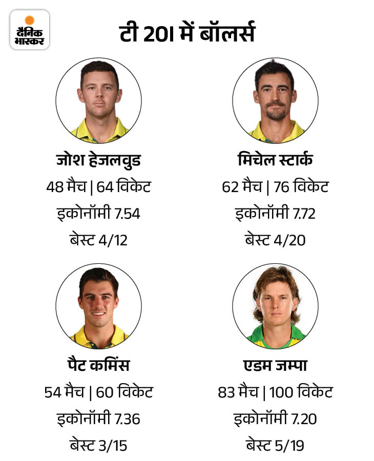 - मिचेल स्टार्क ने टी-20 वर्ल्ड कप के खेले 2 मैचों में 9.50 की इकोनॉमी से 2 विकेट लिए हैं। अब तक खेले 62 मैचों में 7.72 की इकोनॉमी से गेंदबाजी की है और 76 विकेट लिए हैं।