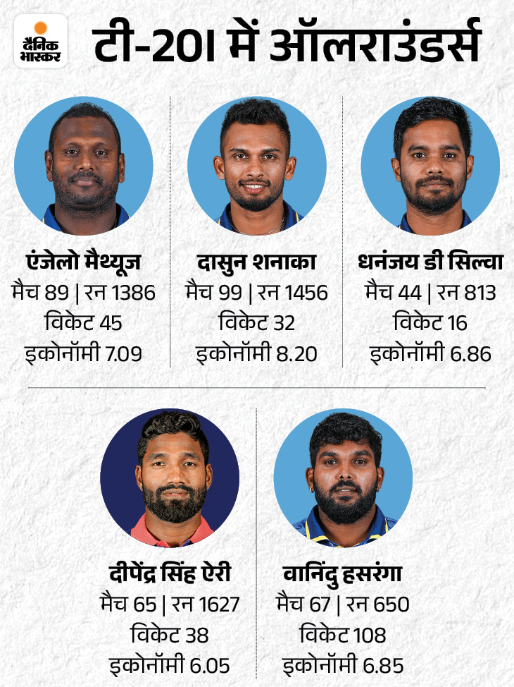 ऑलाराउंडर्स के तौर पर एंजेलो मैथ्यूज, दासुन शनाका, धनंजय डी सिल्वा, दीपेंद्र सिंह ऐरी और वानिंदु हसरंगा को टीम में शामिल कर सकते हैं।