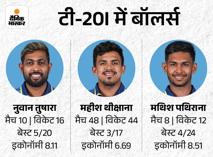 - मथिस पथिराना ने टी-20 वर्ल्ड कप के खेले 2 मैचों में 5.57की इकोनॉमी से गेंदबाजी करते हुए 1 विकेट लिए हैं। अब तक खेले 8 मैचों में 8.51 की इकोनॉमी से गेंदबाजी की है और 12 विकेट लिए हैं। पथिराना ने हाल ही में संपन्न IPL के खेले 6 मैचों में 7.68 की इकोनॉमी रेट से 13 विकेट लिए हैं।