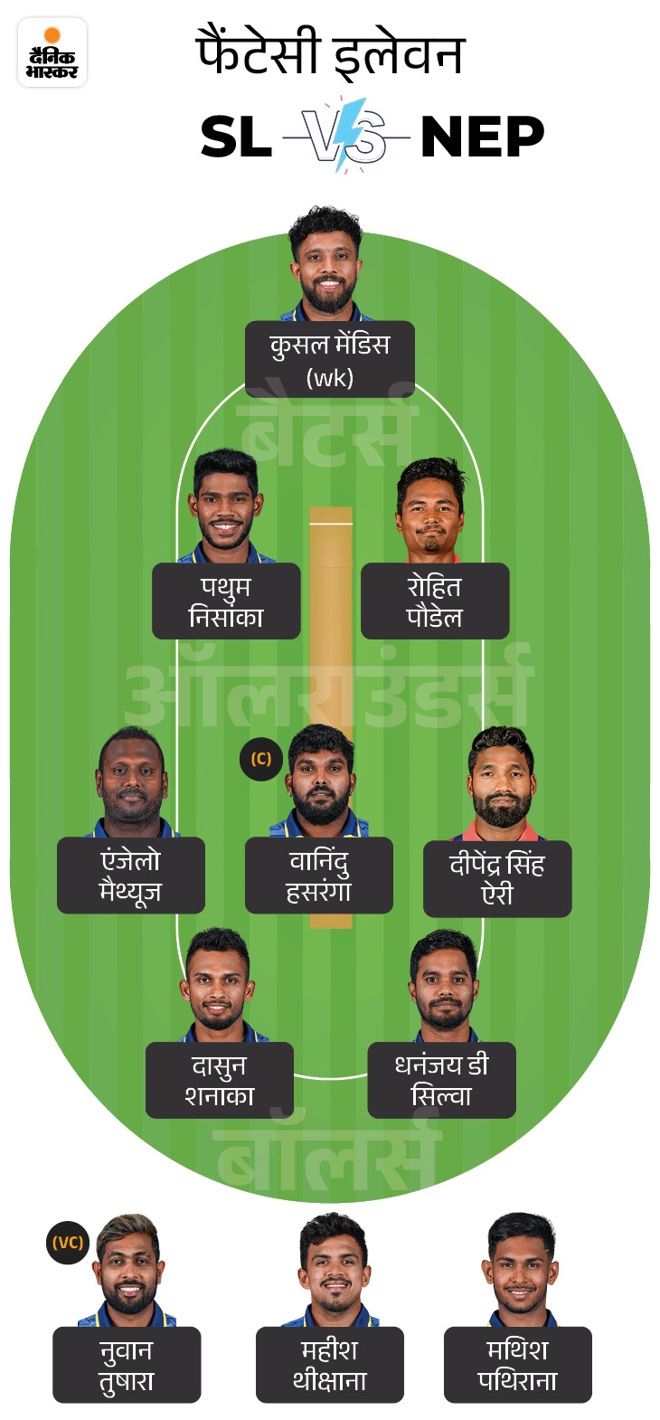 बल्लेबाज के तौर पर पथुम निसांका और रोहित पौडेल को टीम में शामिल कर सकते हैं।