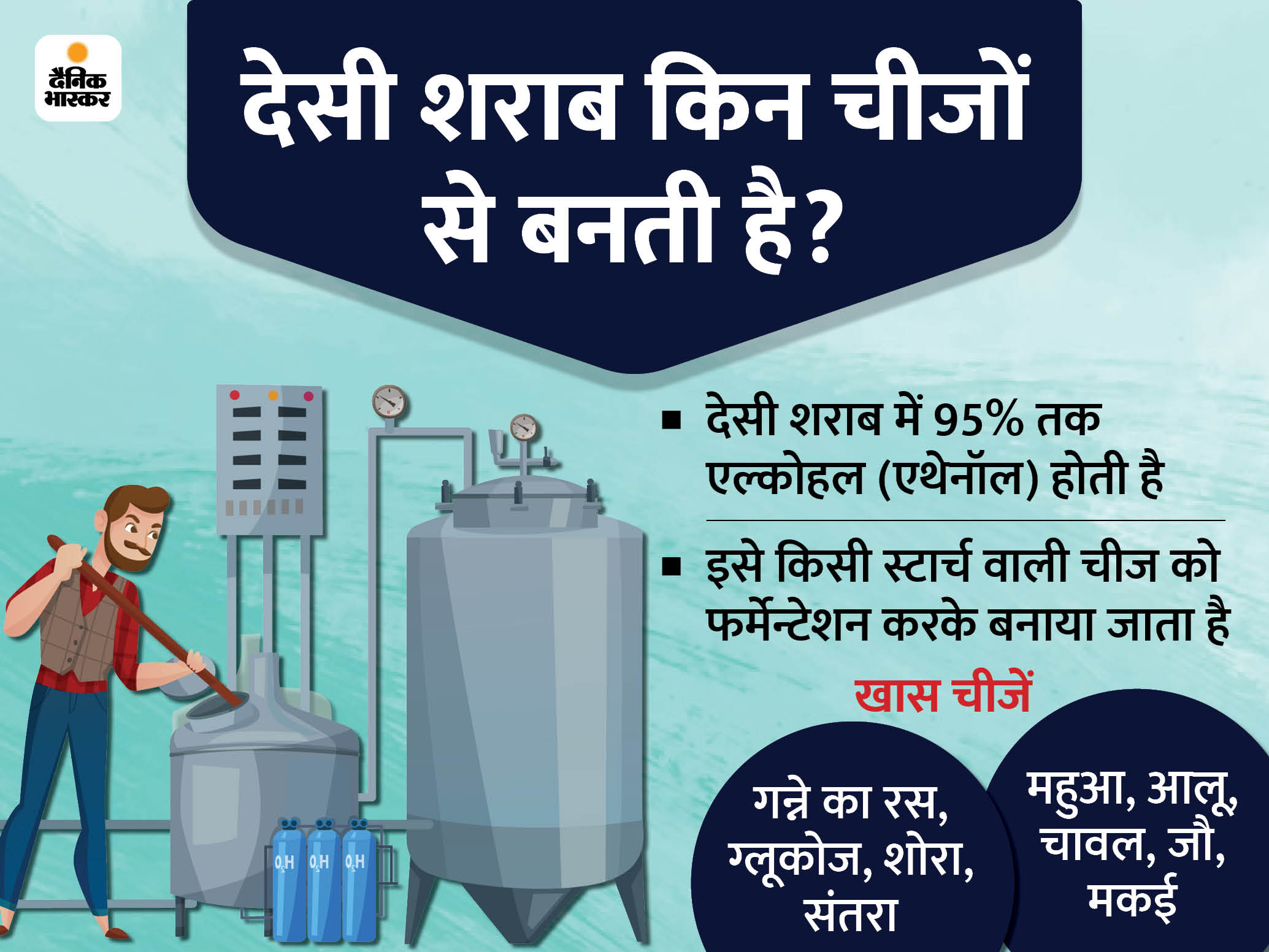- क्यों देसी शराब पीने से हो जाती है मौत: देसी शराब में अमोनियम नाइट्रेट (यूरिया) और ऑक्सीटोसिन मिलाने से मेथेनॉल (मिथाइल एल्कोहल) बन जाता है। यही बाद में मौत का कारण बनता है। मेथेनॉल की अधिकता से शराब टॉक्सिक बन जाती है। इसके बाद मेथेनॉल जब शरीर में मेटाबोलाइज होता है तो वो फार्मेल्डिहाइड बनाता है और बाद में फॉर्मिक एसिड बन जाता है, जो कि जहर है। इसके शरीर में जाते ही ब्रेन और आंख सबसे पहले प्रभावित होती हैं। इसके बाद बॉडी के दूसरे ऑर्गन काम करना बंद कर देते हैं और व्यक्ति की मौत हो जाती है।