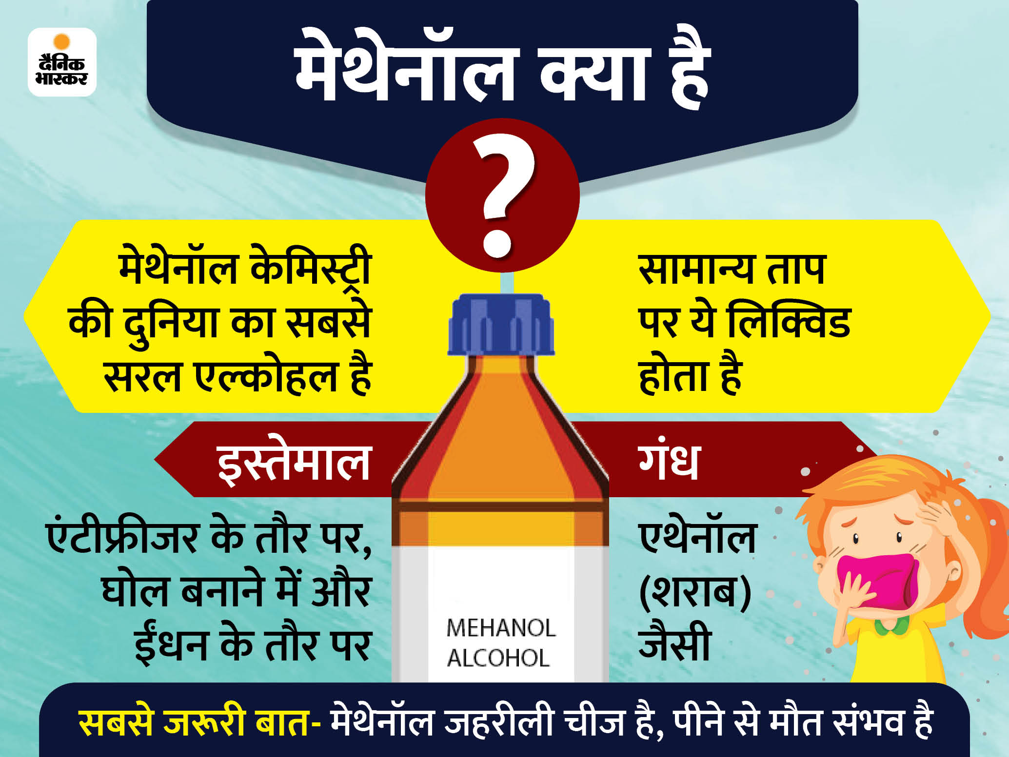 - मेथेनॉल की कितनी मात्रा खतरनाक होती है: 15 से 500 ML तक की मात्रा लेने पर व्यक्ति की मौत हो जाती है। ऑक्सीटोसिन से नपुंसकता और नर्वस सिस्टम से जुड़ी बीमारियाें का खतरा रहता है। आंखों की रोशनी भी जा सकती है।