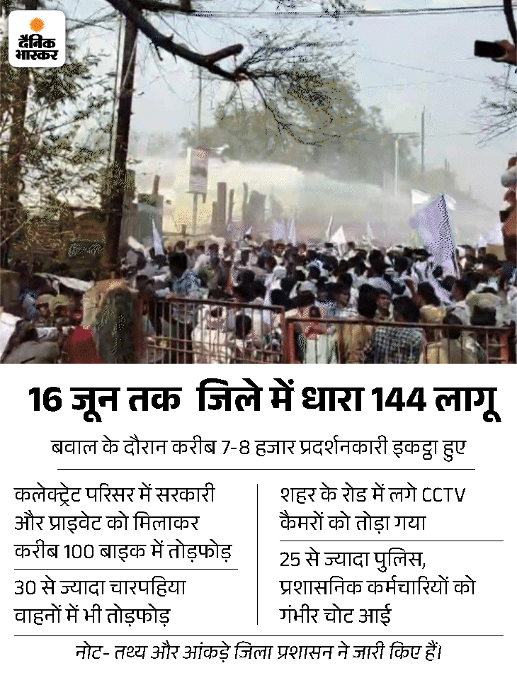- 10 जून : इसी प्रदर्शन के दौरान अचानक से लोग उग्र हो गए और बवाल बढ़ता चला गया। हिंसा के दौरान कलेक्टर-एसपी दफ्तर में आगजनी की गई। कई गाड़ियां जला दी गई।