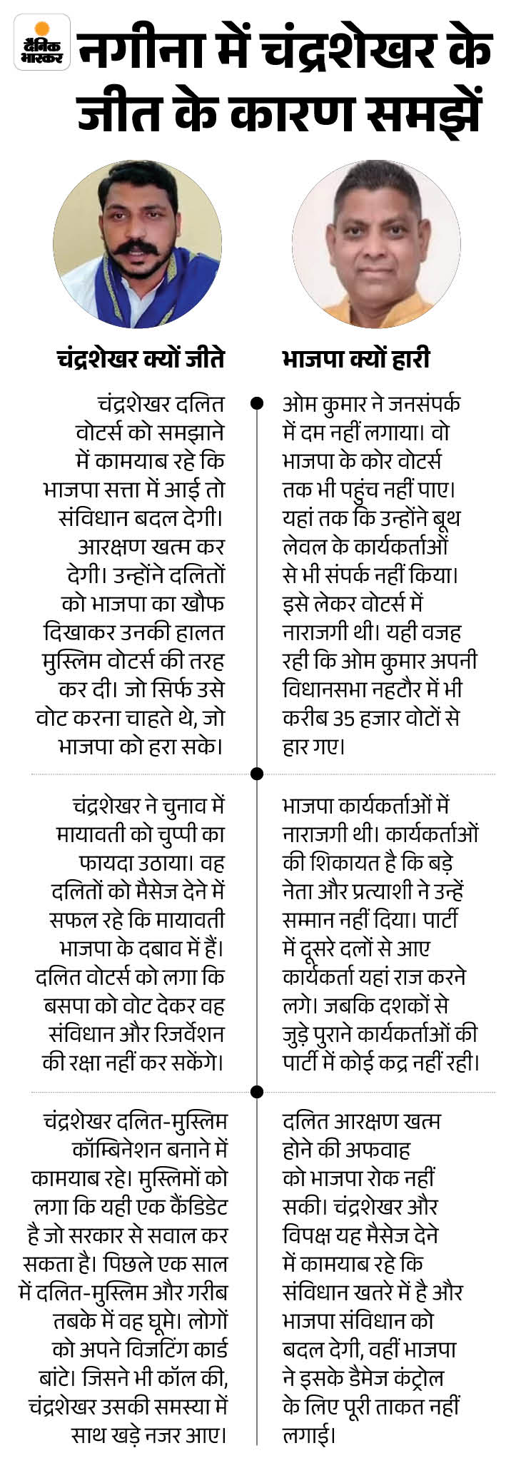 वीर सिंह कहते हैं- नगीना में चंद्रशेखर की जीत के कई कारण हैं। उनमें से एक बड़ा कारण है मायावती के ऊपर लगा भाजपा का ठप्पा है। दलित समाज में एक मैसेज चला गया कि बहनजी भाजपा के लिए काम कर रही हैं। बसपा इस मैसेज को तोड़ नहीं सकी। दलितों का रुझान चंद्रशेखर की ओर देखकर मुस्लिमों ने सोचा कि भाजपा को वही हरा सकते हैं। चंद्रशेखर बोलने वाले नेता हैं। उन्होंने सरकार के खिलाफ भाषण और बयानबाजी करके मुस्लिमों को अपनी ओर खींच लिया।