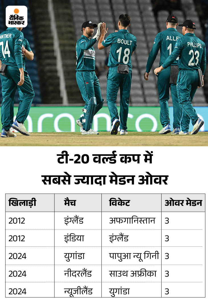 न्यूजीलैंड की ओर से इस मुकाबले में शानदार गेंदबाजी देखने को मिली। टीम के गेंदबाजों ने कुल तीन ओवर मेडन किए और टी-20 वर्ल्ड कप में सबसे मेडन ओवर डालने के रिकॉर्ड की बराबरी की। टीम की ओर से बोल्ट, साउदी और रचिन ने 1-1 ओवर मेडन किया।