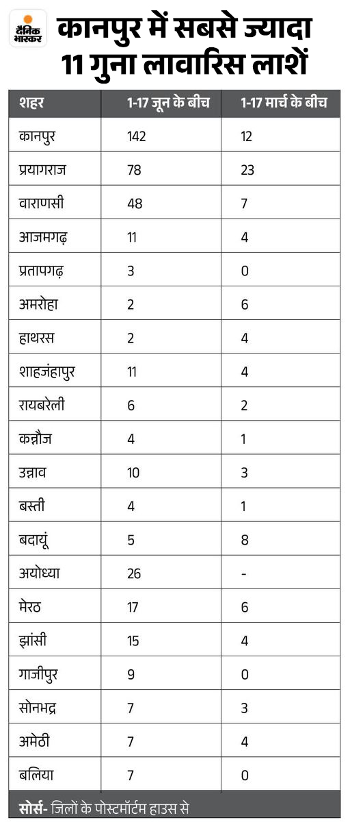 इस दौरान लावारिस लाशों की संख्या बेतहाशा बढ़ी। 1 से 17 मार्च के बीच 92 लावारिस लाशें मिलीं, जबकि 1 से 17 जून के बीच यह संख्या 414 रही।
