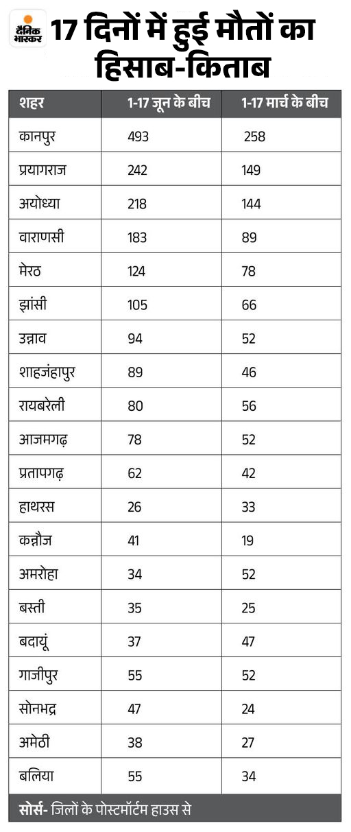 यूपी में इस बार गर्मी ने कहर बरपाया। 20 शहरों में सामान्य दिनों की तुलना में 4 गुना ज्यादा लावारिस लाशें मिलीं। पोस्टमॉर्टम हाउस में भी डेढ़ गुना से ज्यादा शवों का पोस्टमॉर्टम हुआ। बड़े शहरों वाराणसी, प्रयागराज और कानपुर में तो मॉर्च्युरी में शव रखने त