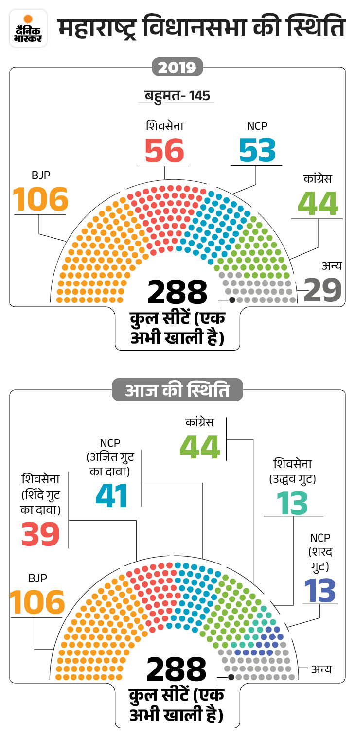 महाराष्ट्र विधानसभा का कार्यकाल 4 महीने बचा है। सूत्रों के अनुसार शिंदे या अजित गुट के विधायक तुरंत दल नहीं बदलेंगे। वे 4 महीनों में सत्ता मे रहकर क्षेत्र के लिए बड़ा फंड लेंगे। विधानसभा चुनाव करीब आने पर दल-बदल दिख सकता है।