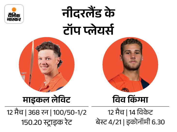 इस बीच, डच गेंदबाज, अपने बेहतर प्रदर्शन को दोहराना चाहेंगा। टीम के लिए पेसर विव किंग्मा कमाल कर सकते हैं। इस वर्ल्ड कप टीम के लिए साइमन एंगलब्रैक्ट ने 3 मैचों में 87 रन बनाए हैं। जबकि, लोगन वान बीक के नाम सबसे ज्यादा 3 मैचों में 5 विकेट है।