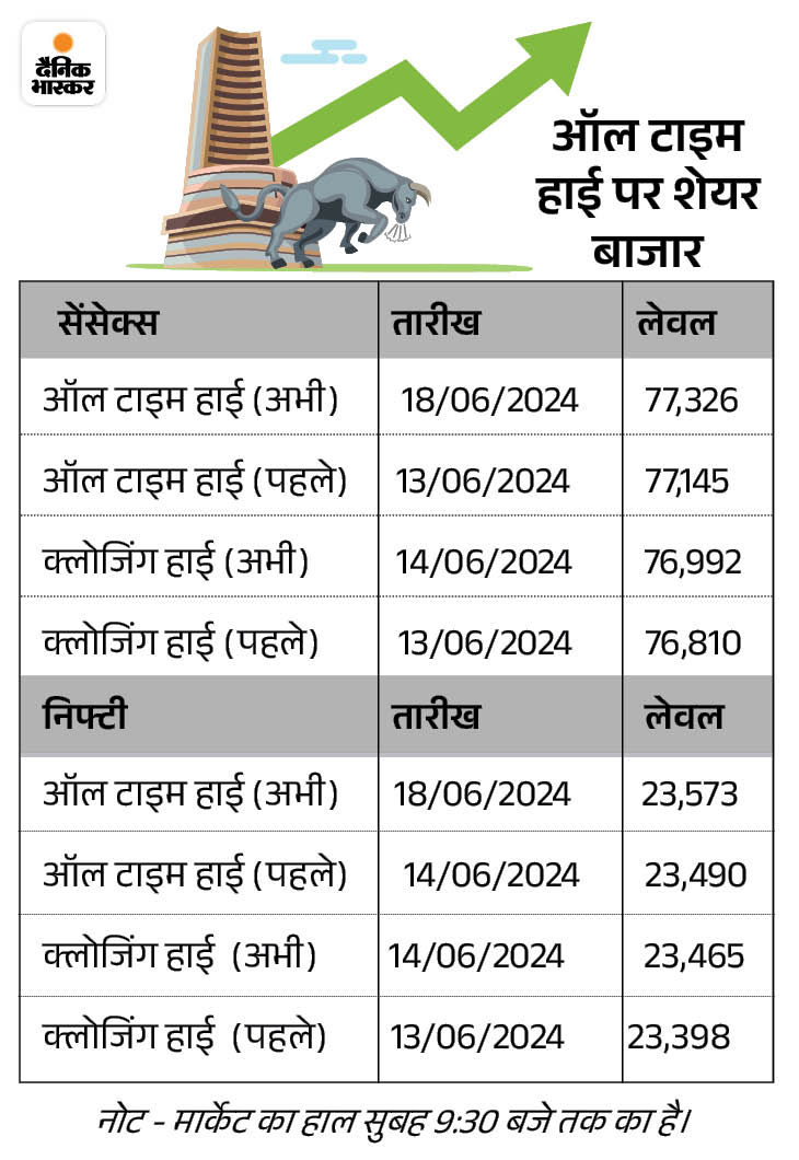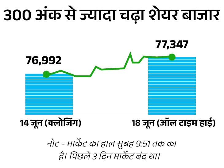 शेयर बाजार ने आज यानी 18 जून को नया ऑल टाइम हाई बनाया है। सेंसेक्स ने कारोबार के दौरान 77,347 का स्तर छुआ। फिलहाल ये 300 अंक से ज्यादा की तेजी के साथ 77,300 के स्तर पर कारोबार कर रहा है।