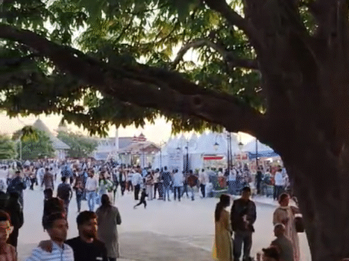 वाराणसी के गौदोलिया में गर्मी से राहत देने के लिए पानी का छिड़काव करने की मशीन लगाई गई है।
