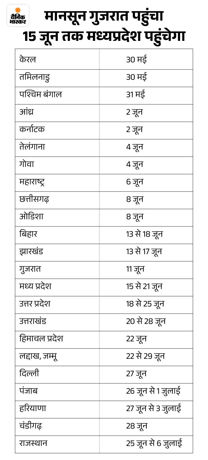 मौसम विभाग के मुताबिक, मानसून के 16 से 18 जून तक बिहार और झारखंड पहुंचने का अनुमान है। यह 20 से 30 जून के बीच उत्तर प्रदेश और 27 जून के आसपास दिल्ली पहुंच सकता है।