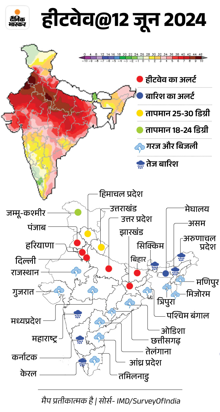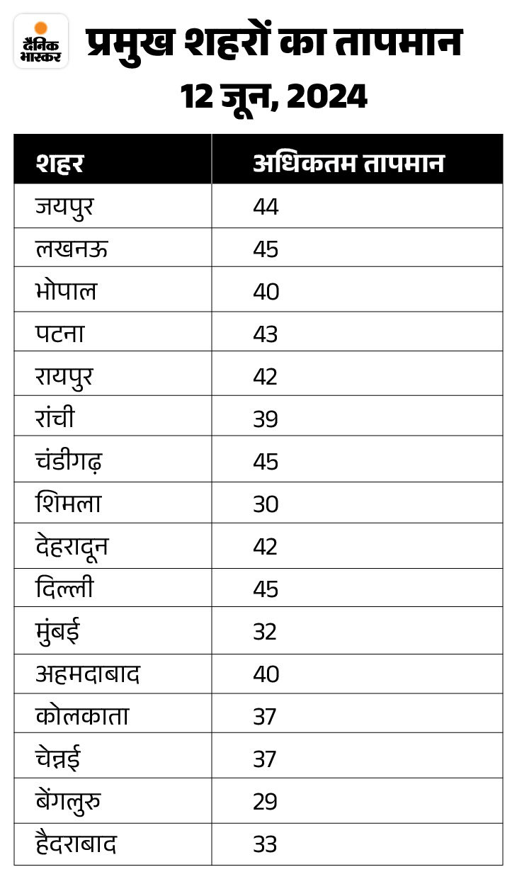 बुधवार 12 जून को उत्तराखंड, हिमाचल प्रदेश, पंजाब, झारखंड, पश्चिम बंगाल में हीटवेव चली। झारखंड, दक्षिणी उत्तर प्रदेश, हरियाणा, चंडीगढ़, दिल्ली, पंजाब और उत्तरी राजस्थान में कई जगहों का तापमान 45 से 47 डिग्री तक रिकॉर्ड किया गया। UP का कानपुर (IAF) 47.5 डिग्री तापमान के साथ सबसे गर्म रहा।