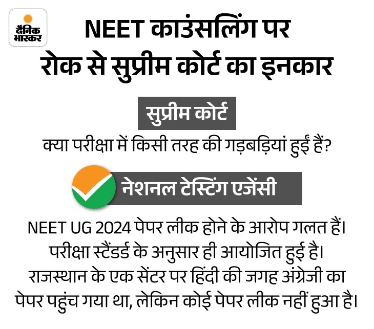हालांकि, SC ने NEET काउंसलिंग पर रोक लगाने से इनकार कर दिया था और NTA को नोटिस जारी किया था। कोर्ट ने NEET UG 2024 में पेपर लीक, ग्रेस मार्किंग सहित अन्य गड़बड़ियों पर सवाल उठाए थे।