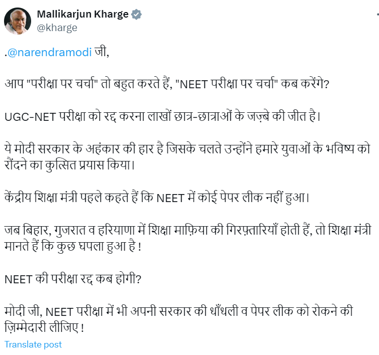 कांग्रेस अध्यक्ष मल्लिकार्जुन खड़गे ने 19 जून को NEET विवाद पर प्रधानमंत्री मोदी पर निशाना साधा। उन्होंने लिखा- आप परीक्षा पर चर्चा तो बहुत करते हैं, NEET परीक्षा पर चर्चा कब करेंगे ? उन्होंने केंद्र सरकार के UGC-NET जून सेशन को रद्द करने के फैसले की सराहना की।